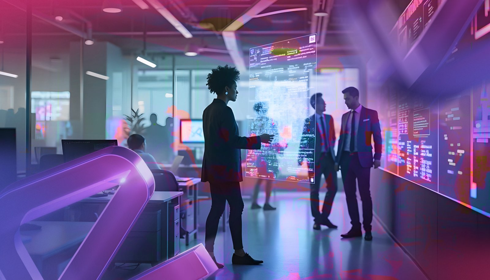 Innovative professionals interacting with advanced digital interfaces in a high-tech office, showcasing the expertise and futuristic approach of the IT Service Company in Dubai — Neo Digital Hub.